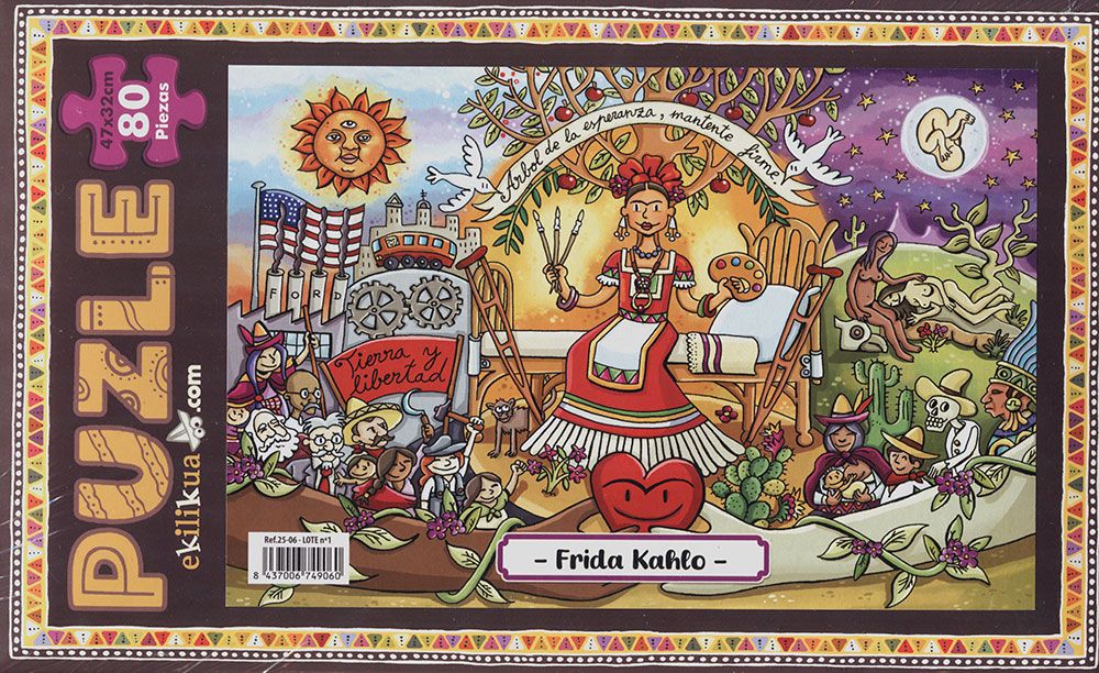 Puzle de Frida Kahlo, una artista curiosa y valiente, con su cabello trenzado y su colorido tocado de flores. ¡Arma las piezas y dale vida a un mundo lleno de arte, color y un poco de magia mexicana!